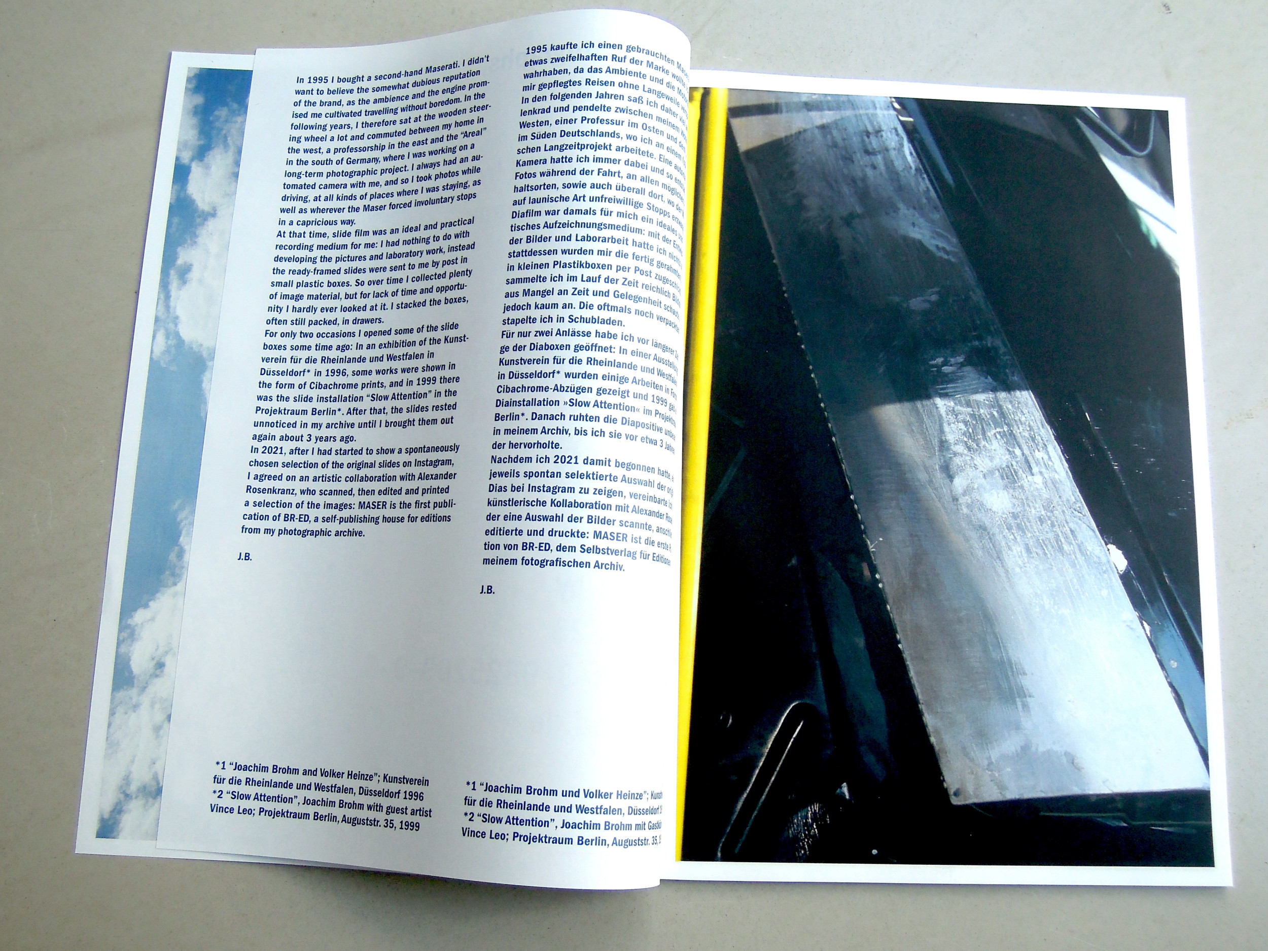 Den etwas zweifelhaften Ruf der Marke wollte ich nicht wahrhaben, da das Ambiente und die Motorisierung mir gepflegtes Reisen ohne Langeweile versprach. In den folgenden Jahren saß ich daher viel am Holzlenkrad und pendelte zwischen meinem Wohnort im Westen, der Hochschullehre im Osten und dem „Areal“ im Süden Deutschlands, wo ich an einem fotografischen Langzeitprojekt arbeitete. Eine automatisierte Kamera hatte ich immer dabei und so entstanden Fotos während der Fahrt, an allen möglichen Aufenthaltsorten, sowie auch überall dort, wo der Maser auf launische Art unfreiwillige Stopps erzwang.“ J.B. (Text-Ausschnitt aus MASER)